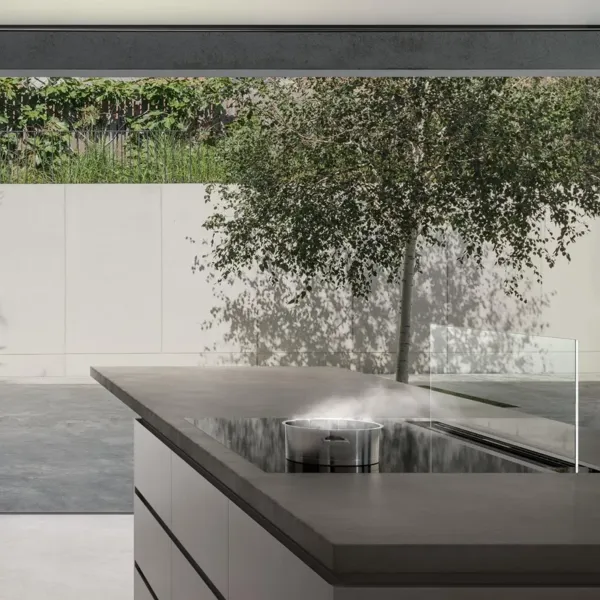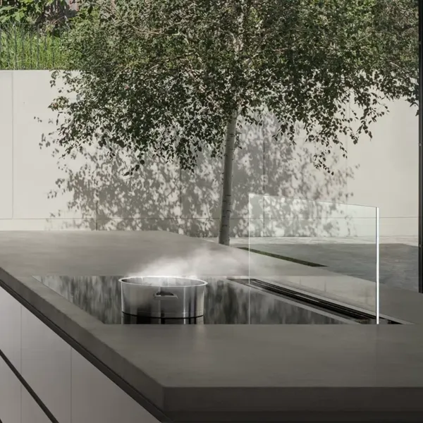 Optisch verschmilzt die Lüftung mit den nahtlos integrierbaren, rahmenlosen Induktionskochfeldern zu einer ästhetischen Einheit. Sie perfektioniert das Kocherlebnis und eignet sich besonders für Kochinseln, bei denen das Kochfeld zum kommunikativen Zentrum der Küche avanciert. Elegant harmoniert beispielsweise das rahmenlose Vollflächen-Induktionskochfeld, das jetzt neu in opak Tiefschwarz erhältlich ist