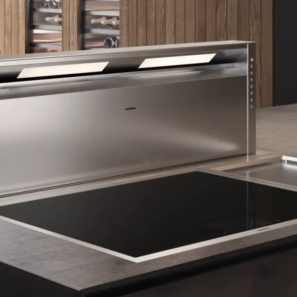 Unsichtbar, wenn sie nicht in Gebrauch ist, elegant und diskret, wenn sie läuft: Die neue ausfahrbare Tischlüftung von Gaggenau ermöglicht grenzenloses Küchendesign in anspruchsvollen Lebensräumen. Dank des transparenten Lüftungspaneels aus Glas bietet sie auch im Betrieb freie Sicht auf das Kochfeld und damit auf das Schaffen des Hobbykochs. Eine dezente Ambient-Beleuchtung an den Glaskanten verstärkt die angenehme Atmosphäre beim Kochen.