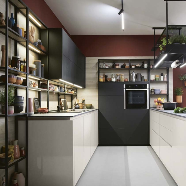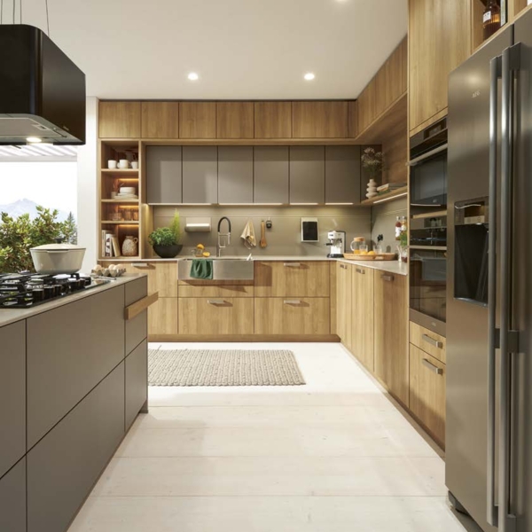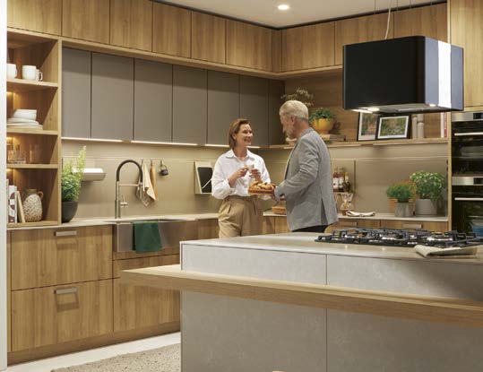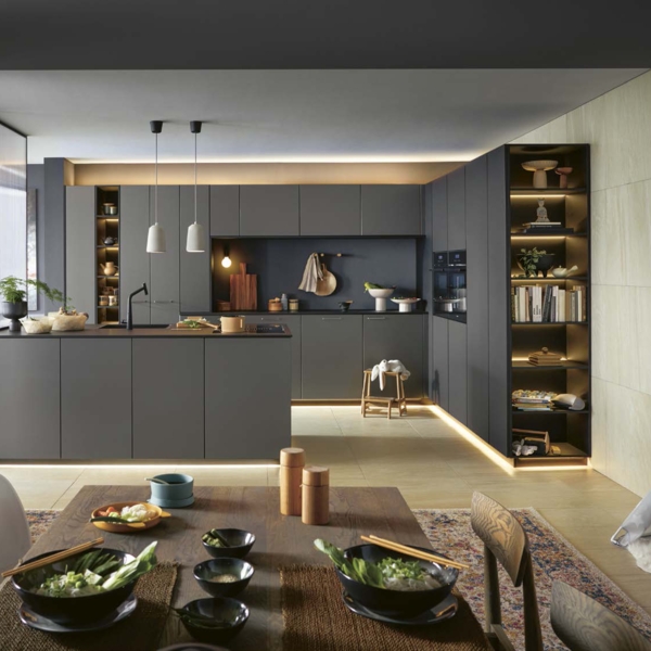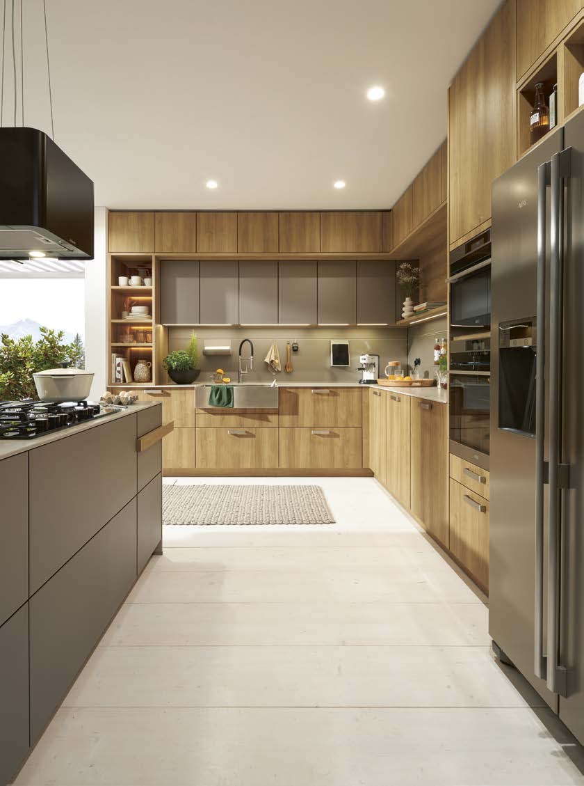 Dafür sorgen auch die schwenkbaren Steckdosen, der Tischlüfter, die stilvoll beleuchteten Wangenregale, sowie die extratiefen Oberschränke, die eine Linie mit den Hochschränken ergeben und genügend Stauraum für Vorräte oder Utensilien bieten.