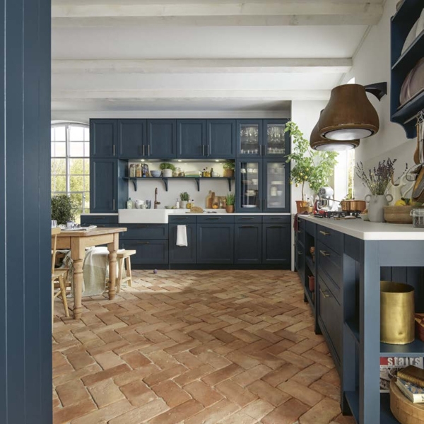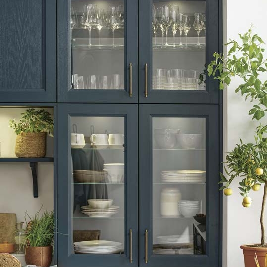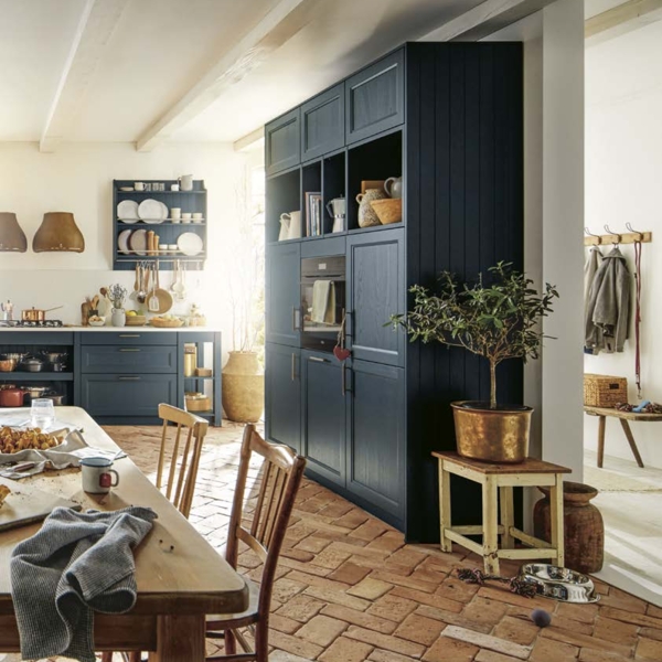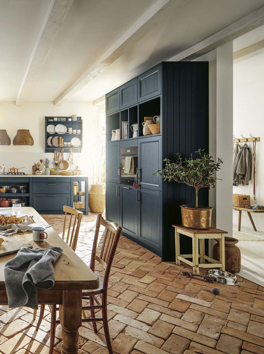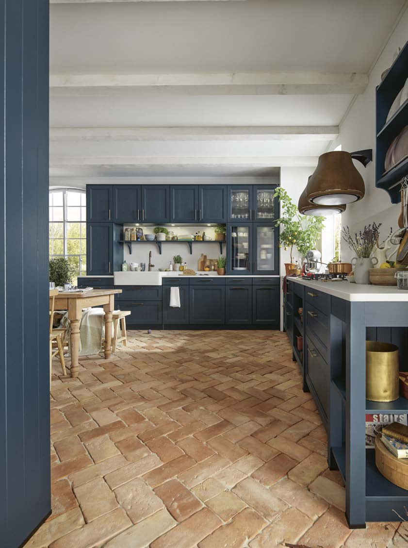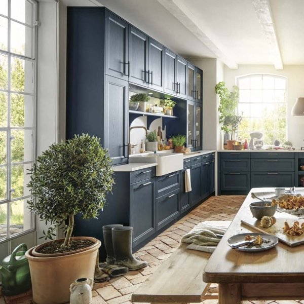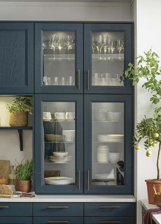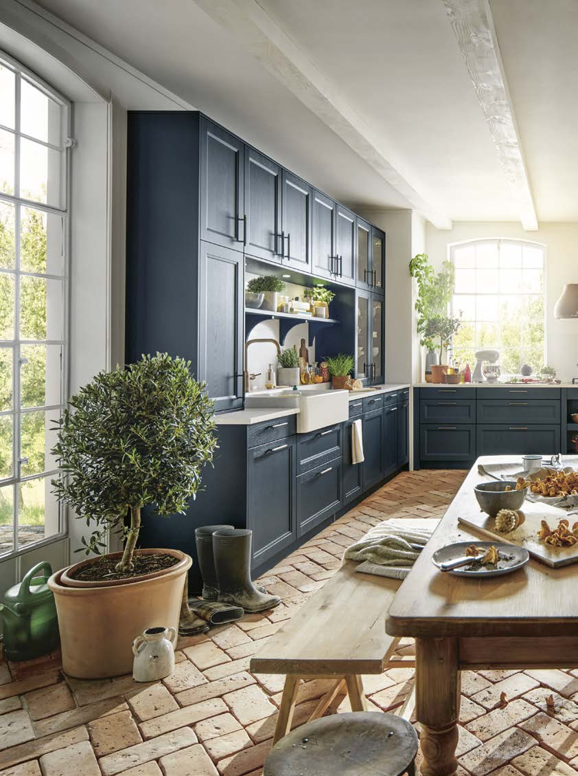 Der Country-Style-Charakter der Küche wird von der tiefblauen Satinlack-Front mit Pore getragen, die durch ihre Holzmaserung und edle Messinggriffe Behaglichkeit vermittelt. Die Quarzstein-Arbeitsplatte von Systemo und die Glastüren setzen harmonische Akzente.