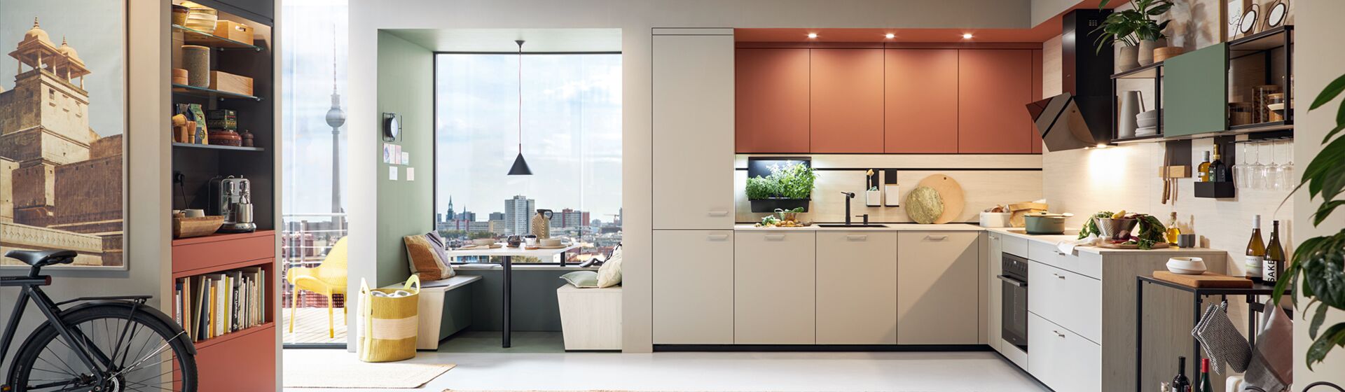Next Generation Küche: Die Fronten mit Anti-Fingerprint-Eigenschaften in Kieselgrau matt sorgen in Kombination mit den farbenfrohen Colour Varianten für ein freundliches Raumgefühl, das sich bis in die gemütliche Essnische zieht. Das 100 % recyclingfähige Frontmaterial stammt zu 71 % aus Kreislaufwirtschaft und dient dem Klimaschutz. Optisch punktet die Küche durch frontbündige Deckenblenden sowie das Frame Rack-Regal mit Schiebetür.