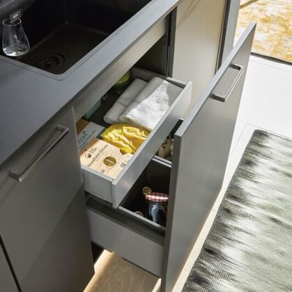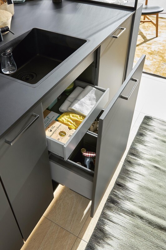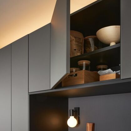 Für weiteren Komfort in der Schüller-Küche sorgen schwenkbare Steckdosen, der Tischlüfter, stilvoll beleuchtete Wangenregale und extratiefe Oberschränke, die eine Linie mit den Hochschränken ergeben und genügend Stauraum für Vorräte oder Utensilien bieten. Durch die Einführung einer neuen Zargenhöhe für Schubkästen mit Frontblenden 19,1 cm und 25,9 cm kann der zur Verfügung stehende Stauraum besser genutzt werden. Und es sieht schöner aus. Um bei Hochschränken eine klare Optik zu erzeugen, sind auch hierfür jetzt durchgängige Fronten in den Korpushöhen 201 cm und 227 cm verfügbar.