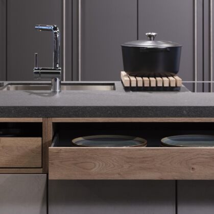 In der Küche bieten solche Auszugsregale hohen Bedienkomfort und natürlich auch einen gewissen Einblick in das, was sie beherbergen. Sämtliche Küchenschränke sollte man nicht damit ausstatten, dann wirkt die Küche schnell unruhig und möglicherweise auch unaufgeräumt. Am schönsten wirken Englische Züge als Duo oder Trio nebeneinander eingebaut, am besten noch mit kontrastierender Frontfarbe. So werden sie zu einer gelungenen Küchenzierde.