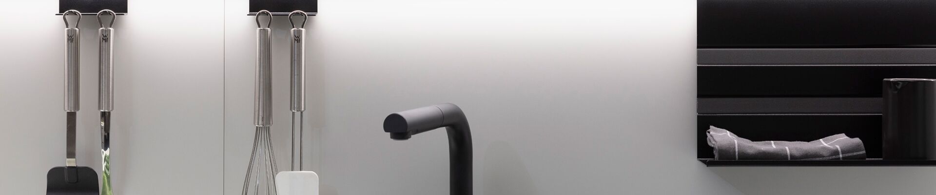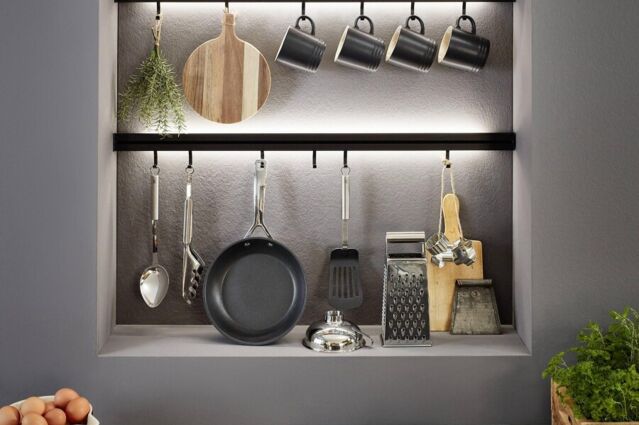 Auch bei den Reling-Systemen hat sich einiges getan, nicht nur in Bezug auf die Elemente zum Anhängen, Stellen oder Verstauen verschiedenster Küchenutensilien. Inzwischen kommen viele Wandstecksysteme mit indirekter LED-Beleuchtung, welche rück- oder unterseitig integriert ist.